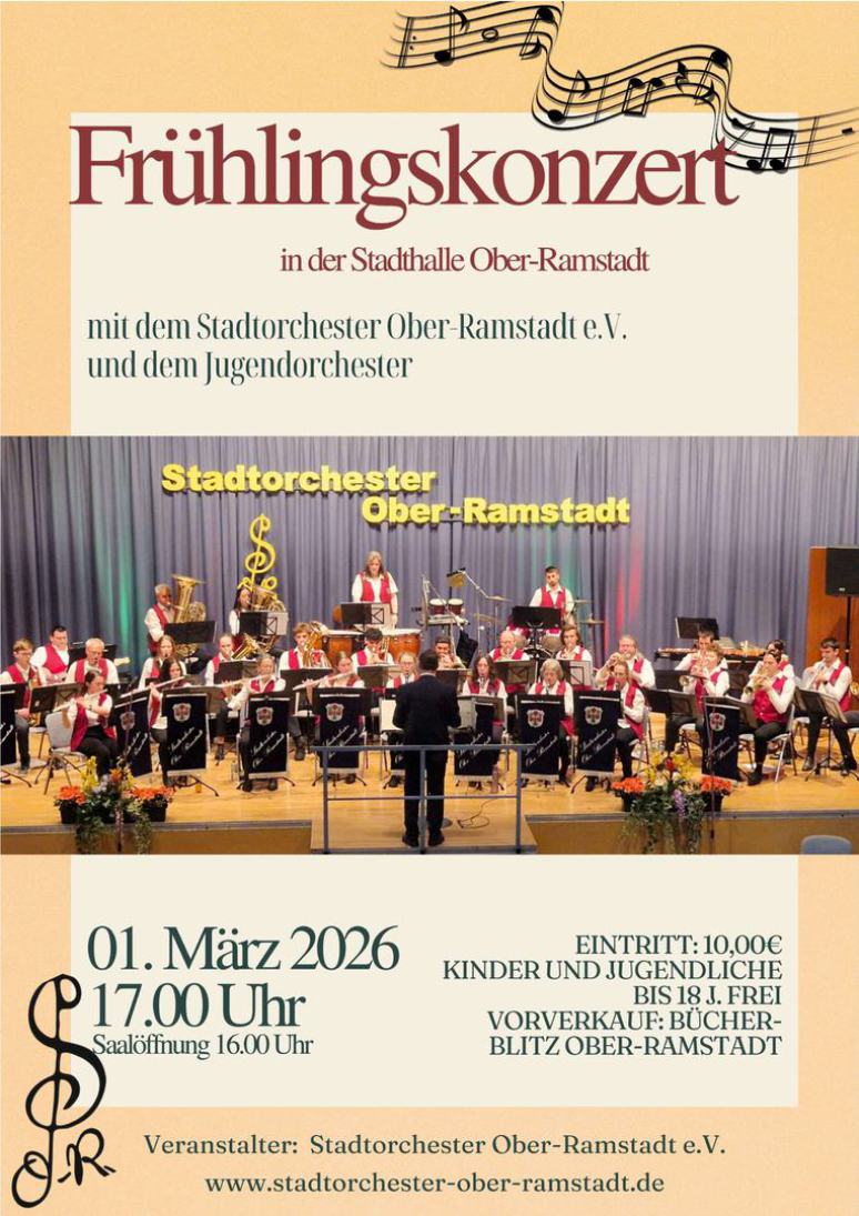 Am Sonntag, den 23. März 2025, fand in der Stadthalle Ober-Ramstadt das Frühlingskonzert des Stadtorchesters Ober-Ramstadt e.V. statt. Ein feierliches Trompetensolo mit Orgelbegleitung eröffnete das Konzert mit "The Prince of Denmark’s March" und stimmte das Publikum auf einen besonderen Abend ein.